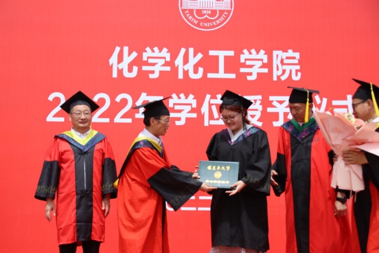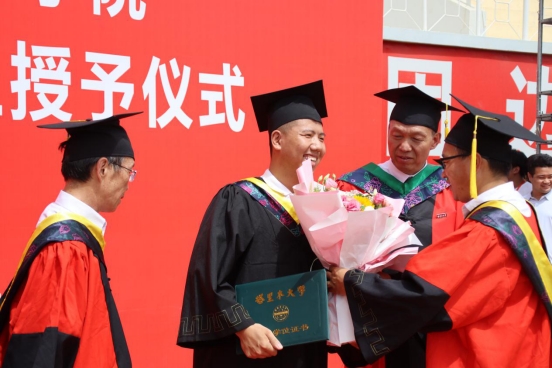 党委常委、副董事长于军和院领导来到仪式现场,为毕业生颁发学位证,毕业纪念品并合影留念。毕业生依次登台领取学位证。
