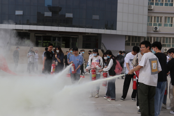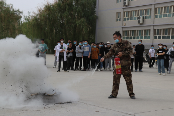 保卫部老师就灭火器和消火栓的使用方法及注意事项、日常防火措施、如何扑救初期火灾、遇到灾情如何自救自护组等方面进行了具体讲解,并组织全体同学在老图书馆进行消防实战演练。