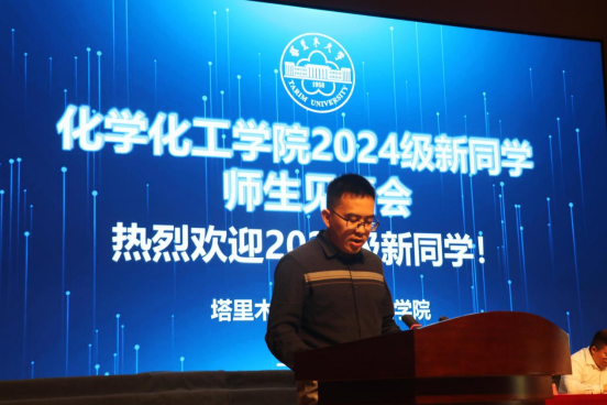 在校生代表化学工程与工艺2021级2班李珍明同学分享了自己三年的老员工活,讲述了获得2023年度“国家奖学金”荣誉的经历,并勉励新同学们担当奉献,励志图强,积极承担社会实践和志愿服务,感恩奉献,开拓进取。