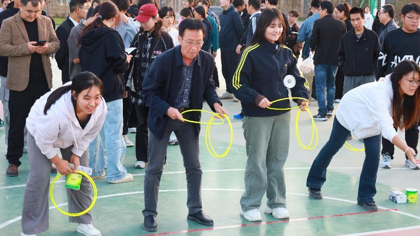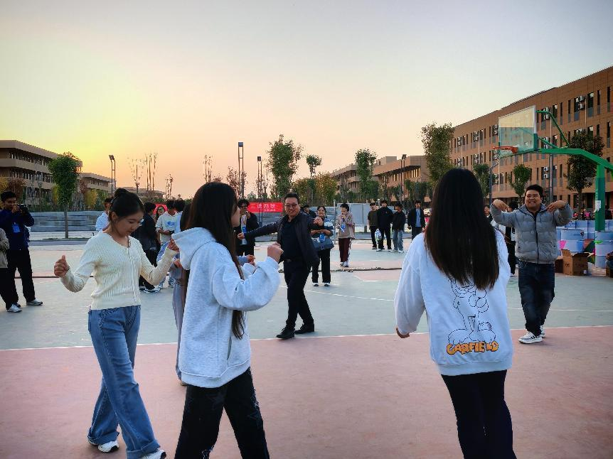 活动现场气氛热烈,师生自由组队、默契配合。拔河比赛中,师生紧握长绳、齐声呐喊,展现出“劲往一处使、心往一处想”的团结力量;套圈区前,教师与员工并肩排队,分享套取奖品的技巧,欢呼声与笑声此起彼伏;投壶场上,师生聚精会神、专心瞄准,每一个进球都引来共同喝彩;最热闹的当属舞蹈环节,师生跟着节奏起舞,大家沉浸在欢快的新疆特色音乐之中,在旋律中传递情谊。