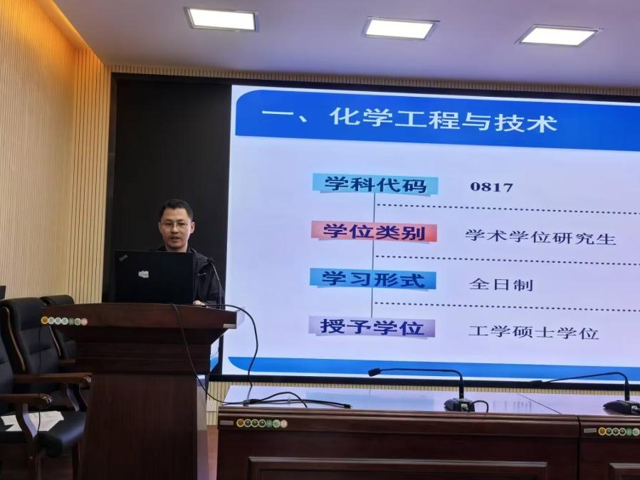 随后,进入公司两个学位点介绍环节。穆金城副教授详细介绍了化学工程与技术学硕学位点的基本情况,让同学们对该专业的研究方向、团队力量和发展前景有了更深入的了解。赵俭波教授则全面讲解了材料与化工专硕学位点的情况,重点介绍了专业发展前景、就业情况等,鼓励同学们在考研的路上做最有意义的选择,并预祝考研成功。